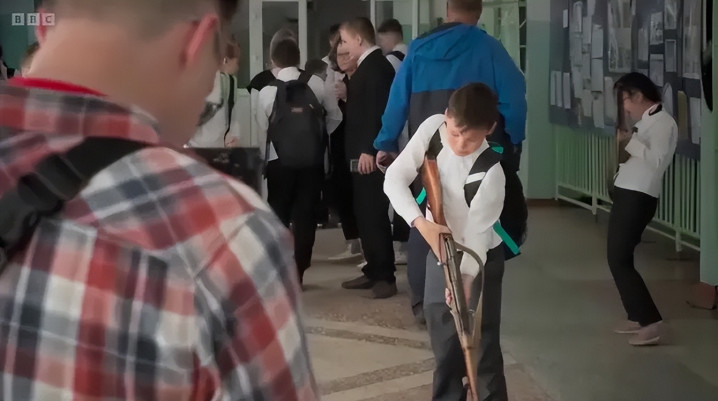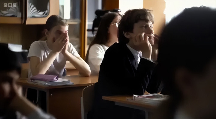 他还给我发来了很多素材,那些都是我们正式开始合作之前,甚至战争还没开始之前他就已经拍下来的。其中有不少第一人称视角的镜头,比如沿着学校走廊往前走的画面。我当时就觉得,他这种拍法特别好,特别有意思。我们很快意识到,正因为他这样的拍摄方式如此准确地捕捉到了日常生活本身的流动,我们才得以看见:随着军事化和「特别军事行动」的影响不断渗透,这所学校在随后几年中是如何缓慢而明确地发生变化的。