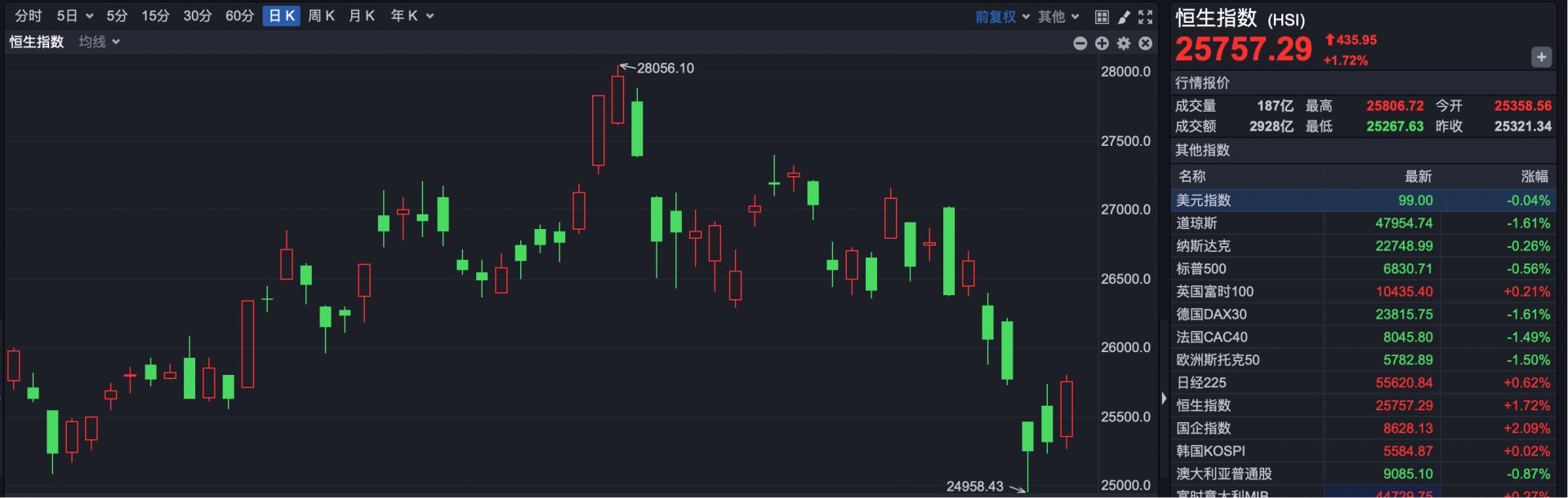 截至收盘,恒生指数报25757.29点,上涨435.95点,涨幅1.72%。