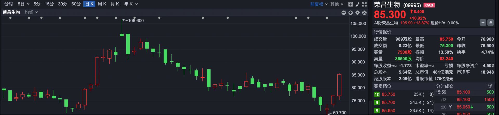生物医药板块普涨,药捷安康-B(HK02617)涨超43%,三生制药涨近10%,宜明昂科涨超17%,荣昌生物涨超10%。